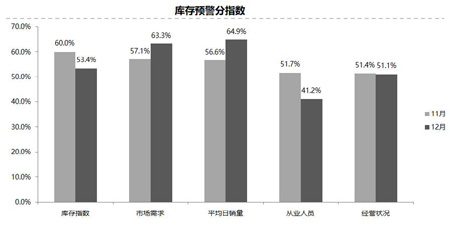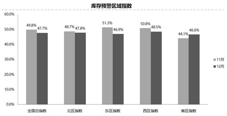 从区域指数情况看:12月份全国总指数为47.7%,北区指数为47.8%,西区指数为48.5%,南区指数为46.6%,东区指数为48.5%。12月份,各区域库存预警指数均位于警戒线以下。