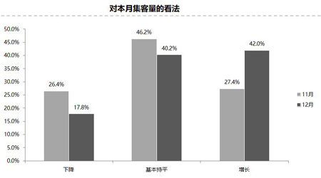 调查显示,12月份集客量增长,认为12月份集客量下降的经销商比例为17.8%;认为增长的比例为42.0%;认为集客量基本持平的比例为40.2%。