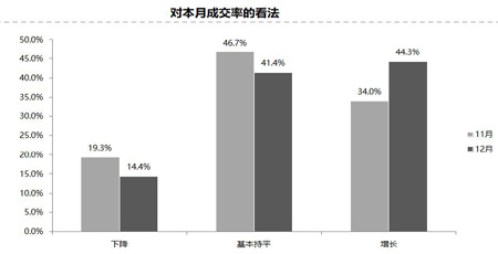 调查结果显示,认为成交率增长的比例为44.3%;认为下降的比例为14.4%;认为基本持平的比例为41.4%。