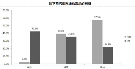 调查显示,多数经销商预计,进入1月份市场需求将有所下降。2018年1月份,购置税优惠政策退出,预计汽车销量将下降。