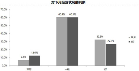 预计1月份经销商经营状况一般。调查显示,认为1月份经营状况“好”的比例为27.0%,认为“不好”的比例为12.6%;认为“一般”的比例为60.3%。