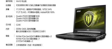 生活中我们总被性能和移动性所限制,不知如何对台式机和移动机做出选择,现在好了,MSI要给你一个移动的台式机——WT75工作站,它拥有出色的运算效能和长时稳定运行的能力,同时以移动工作站的机身融合前所未见的台式机等级P5200显卡和具备台式级同等的长时稳定运行能力,是个实力雄厚的大咖。此外, WT75搭配的英特尔第八代至强处理器更可将性能大幅提升50%, 除了性能提升, 微星也将微软Hello指纹辨识, 智能读卡机英特尔® 身份验证解决方案等安全功能导入WT75, 实现更强悍的个人身份保护。