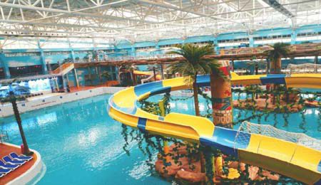 戏水大厅内分为儿童戏水区、造浪区、漂流区、滑道区、水疗区等,整体给人新奇却不失典雅的感受。改造后的戏水大厅引进了智能化水质、温度监测设备,室内恒温30℃,水温28℃,四季如春。