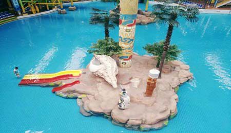 大型水寨“翻斗乐”是孩子们流连忘返的乐园,这座13米高的梦幻水世界迷宫里,色彩斑斓间布满了形态各异的海洋动物,葱绿椰林中巨嘴鸟翘首相斗、蟒蛇盘根,地涌泉、水转轮水花四溅,形色各异的滑梯蜿蜒盘旋,大小翻斗前摇后摆,一道道瀑布从天而降,构成了一幅奇妙的童话般世界。