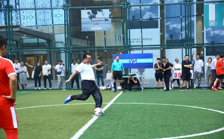 7月13日,在一个月的激烈角逐后,商务部培训中心队和国贸物业部队过五关斩六将,最终在决赛的国贸绿茵场上相遇。哨声吹响,中国国际贸易中心股份有限公司总经理助理高民开球,对决开始了。两队球员火力全开,互不相让。突然,商务部培训中心队一脚飞射,范超率先打破比赛僵局。足球在空中划出一道优美的弧线,承载着众人的目光跃入球门,瞬间引爆全场。下半场,国贸物业部队0:5大比分落后的情况下,穷追不舍,奋勇争先的精神让观众席爆发出阵阵喝彩。