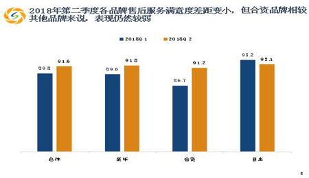 监测报告显示,在品牌服务满意度模块中,2018年第二季度各品牌售后服务满意度差距变小,但合资品牌相较其他品牌来说,表现仍然较弱。从第二季度表现分析,自主品牌相比较第一季度略有下降。
