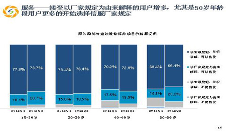在服务方面,服务顾问对建议维修保养项目的解释说明,接受以厂家规定为由来解释的用户增多,尤其是50岁年龄段用户更多的开始选择信服厂家规定。