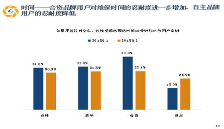 在时间方面,合资品牌用户对维修保养时间的忍耐度,进一步增加,而自主品牌用户的忍耐度降低。分析原因为自主品牌汽车销量的爆发,但是对于汽车售后服务质量是一个挑战,用户维修保养不能按时交车,需要自主品牌有一定警惕性。