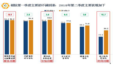 相较2018年第一季度主要的不满因素,在第二季度主要的不满因素略有改变。在服务问题方面,服务顾问提出维修保养建议说明有一定下降,虽然只是-0.1百分比,相比于全行业也是比较大的了,应当给与足够的重视。其它方面均有不同程度提升,其中价格问题和时间问题提升明显。相比于第一季度,进入夏季后各地区经销商进入接车区等待时间缩短,用户满意度提升明显。