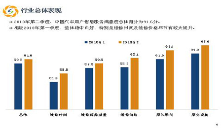 2018年第二季度,中国汽车用户售后服务满意度总体得分为91.6分,相较2018年第一季度,整体稳中向好,特别是维修时间及维修价格环节有较大提升,得分分别为85.5分和92.1分。其主要原因是在第二季度展开了中国汽车流通行业售后服务质量大赛,各地区参赛门店对售后服务质量都有一定要求,导致了整体行业监测数据有一点比例提升。