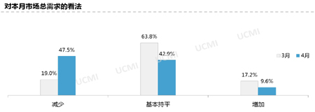 调查显示,4月二手车市场总需求相比3月份明显减少,认为市场总需求“增加”的经销商比例为9.6%;“减少”的比例为47.5%。据大部分经销商反馈,市场环境不理想,新车价格下调,车源较少,4月份二手车市场总体需求较3月略有下降。