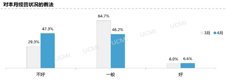 调查显示,经销商认为4月份的经营状况不好,认为经营状况“一般”的比例为46.2%,认为“好”的比例为6.6%,认为“不好”的经销商比例为47.3%。整体市场环境不理想,新车价格冲击,销量下降,整体经营状况不好。