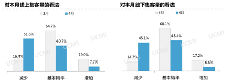 调查显示,4月份线上集客量相比3月均明显减少。其中认为线上集客量“增加”的经销商比例为7.7%,“减少”的比例为51.6%;认为线下集客量“增加”的经销商比例为6.6%,“持平”的比例为48.4%,“减少”的比例为45.1% 。