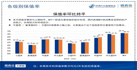 本月保值率与上月基本持平,细分市场当中,MPV一跃成为最保值的车型。这主要是由于MPV可供消费者选择的车型还是偏少,厂商竞争并不激烈,仍有很大的市场空白。保值率环比总体与上月持平,各级别有升有降,其中上涨的都是一些尺寸较大的。置换用户通常会选择这些车。