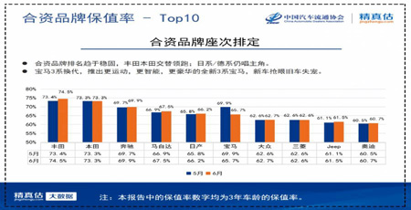 合资品牌排名趋于稳固,长期以来丰田本田交替领跑,日系、德系仍唱主角。宝马3系换代,推出了更运动、更智能、更豪华的全新车型,新车抢眼旧车失宠,6月份保值率略有下降。
