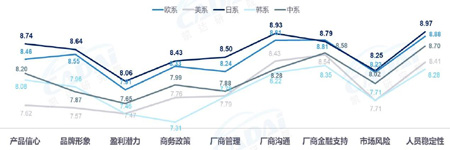 日系品牌经销商信心度占据最高位,美系、韩系信心度分占各环节最低点