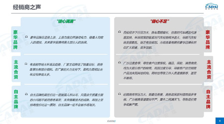 豪华品牌经销商在盈利潜力、厂家管理、市场风险环节的信心度最低,在人员稳定性、厂商沟通、厂商金融支持环节上的信心度最高。合资品牌经销商在产品环节、市场风险环节上的信心度低于自主品牌,在其他环节上的信心度均好于自主品牌。