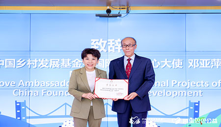 郑文凯理事长向奥运冠军、乒乓球超级全满贯得主邓亚萍颁发“中国乡村发展基金会国际项目爱心大使”荣誉证书