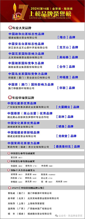 在喜迎澳门回归祖国25周年之际,第17届中国茶品牌创新大会暨第16届“金芽奖·陆羽奖”颁奖盛典与澳门华联品牌60周年庆典同时拉开序幕。这项被誉为“中国茶品牌奥斯卡”的年度奖项,由业界最具影响力的品牌推广机构“中国茶品牌金芽奖组委会”与“金芽品牌战略智库”联合打造的“金芽品牌强国工程”。旨在落实总书记关于“三茶统筹”与做大做强茶产业茶品牌的重要指示,推进中国式现代化茶品牌建设,宣贯品牌评价国家标准,持续推动“金芽品牌强国工程”与提升金芽奖品牌企业在全国消费市场认知力、信誉度与国际竞争力。