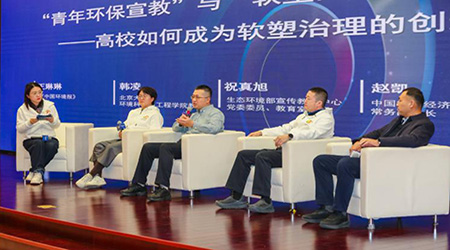 总结会现场还组织了两场专题讨论。第一场专题讨论以“软塑治理的系统路径:从认知到产业的闭环”为主题,学界、政府和行业代表深入探讨了如何打通软塑回收的全链条。生态环境部宣传教育中心党委委员、教育室主任祝真旭认为,要从宣教的层面提高青年环保素养,通过课程、调查、品牌活动等多种方式调动青年共同参与软塑的科普传播;中国物资再生协会再生塑料分会副秘书长周云飞从产业角度指出,软塑回收的关键在于“前后端协同”,他特别强调,高校作为高认知度群体,完全可以实现软塑回收,但必须将其回收体系与社会大循环衔接,才能形成可持续的产业闭环;中国循环经济协会常务副会长赵凯分享了政策层面的最新动向,指出建立中国自己的再生材料标准与认证体系是未来的关键。